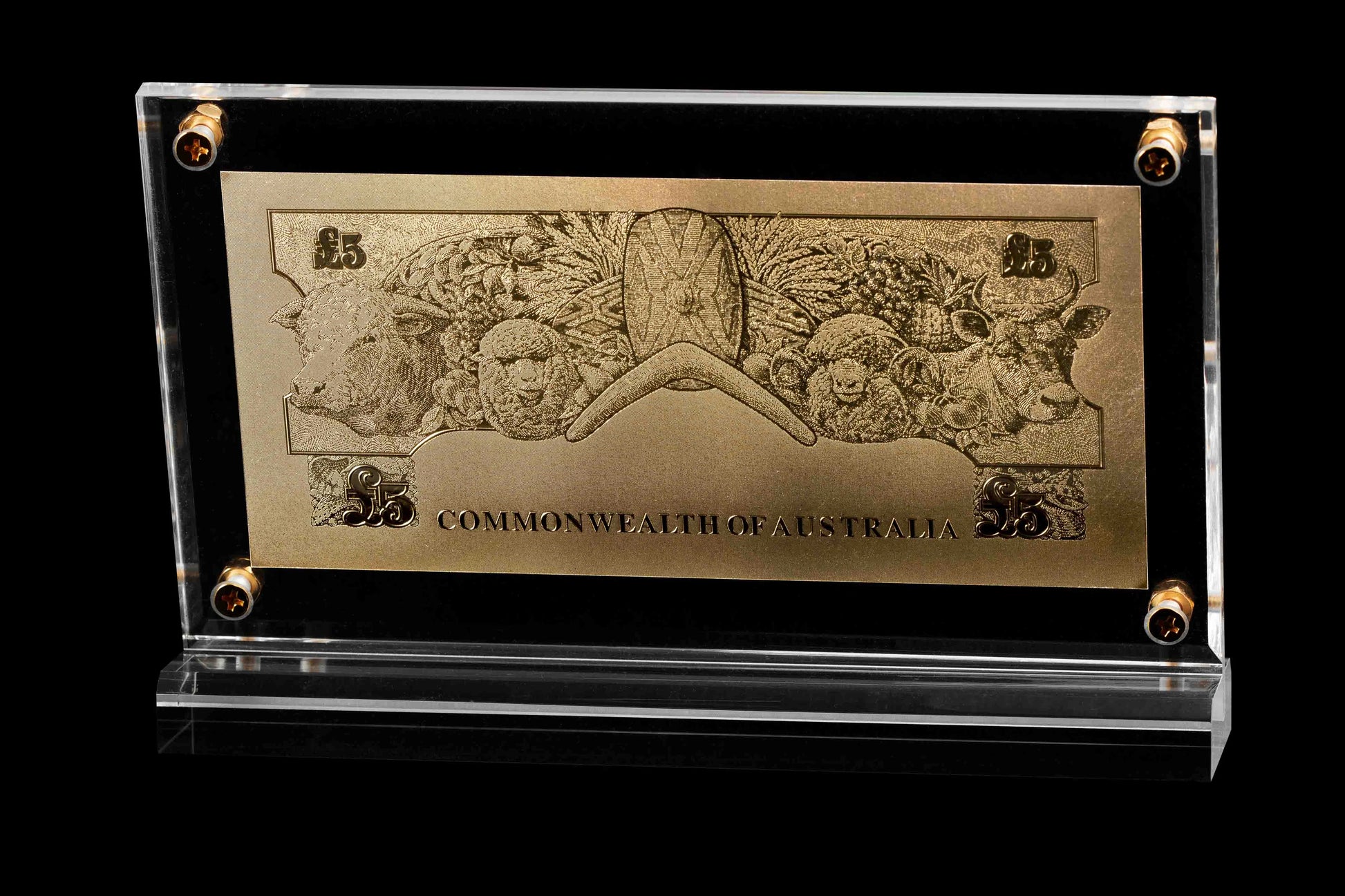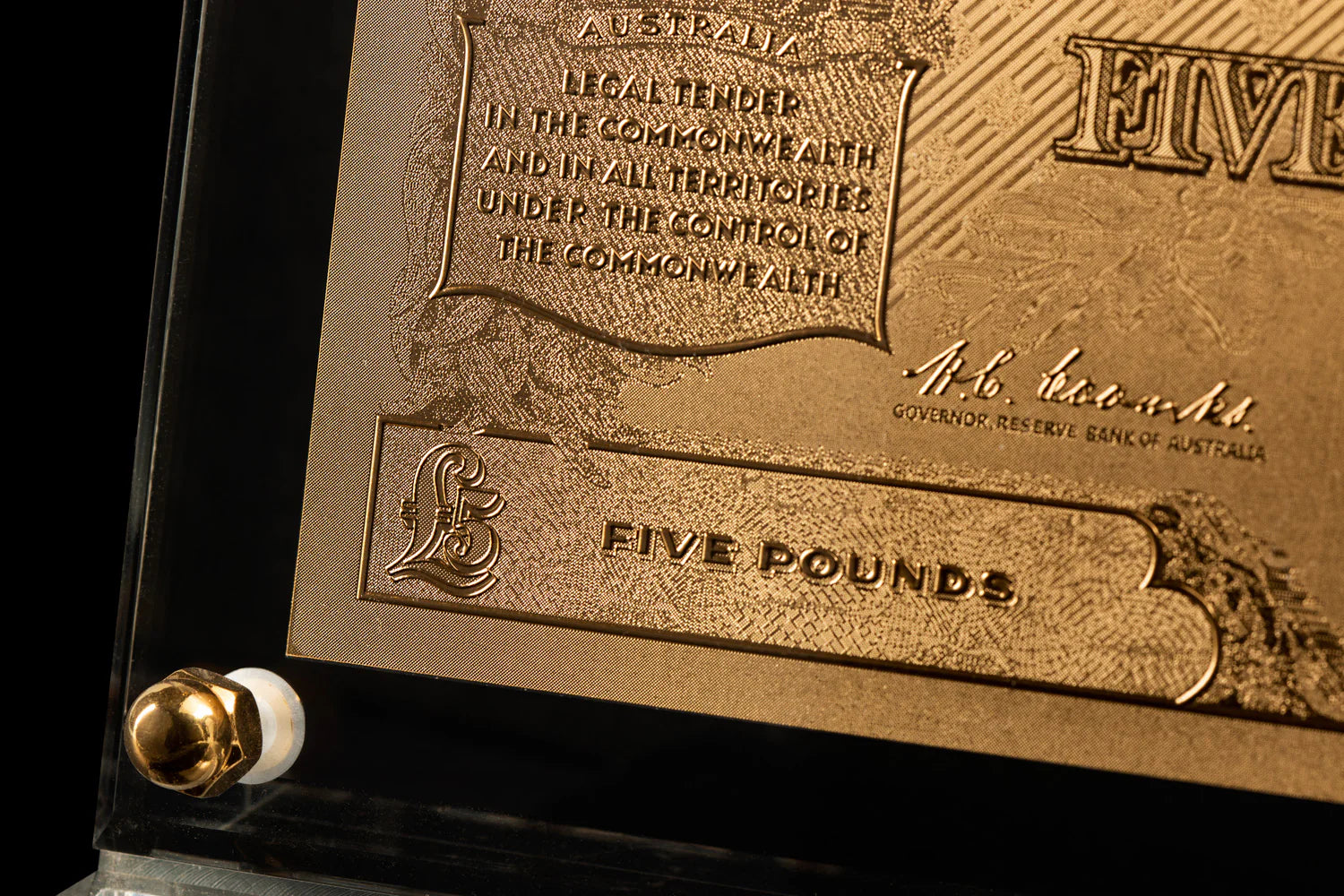 The detail of the artwork on bank notes is where the beauty lies. Our artists meticulously craft a copper mould perfectly replicating the original artwork. From there through a process of trial and error we work on perfecting the amount of relief to achieve the high contrast representation seen on the finished note. Once the mould is completed the 24 carat gold is stamped onto a PMMA sheet (polymethyl methacrylate) to add rigidity & finally mounted onto a display. The finished quality of our replicas speaks for itself & we take much pride in accurately representing the original beauty of each piece of artwork.