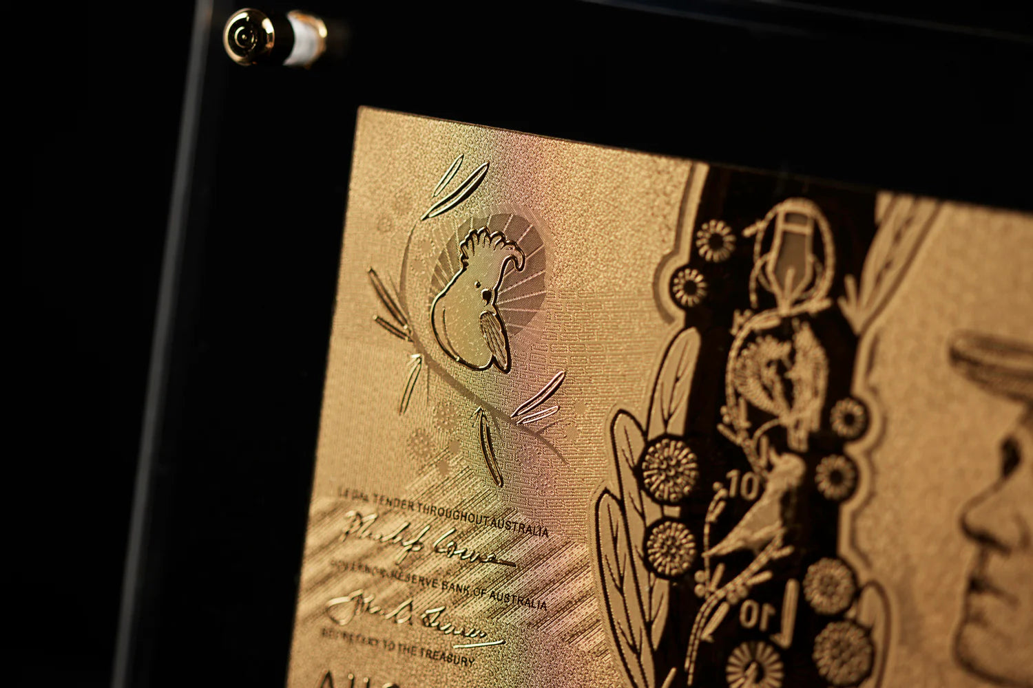 The detail of the artwork on bank notes is where the beauty lies. Our artists meticulously craft a copper mould perfectly replicating the original artwork. From there through a process of trial and error we work on perfecting the amount of relief to achieve the high contrast representation seen on the finished note. Once the mould is completed the 24 carat gold is stamped onto a PMMA sheet (polymethyl methacrylate) to add rigidity & finally mounted onto a display. The finished quality of our replicas speaks for itself & we take much pride in accurately representing the original beauty of each piece of artwork.