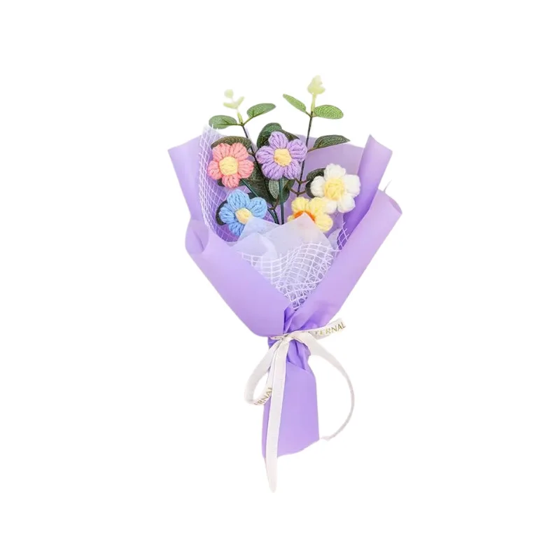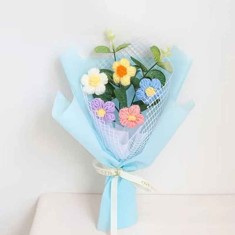 Hot Selling Gift Rose Bouquet Pink Tulip Simulated Flower Yarn Flower Handmade Knitted Flower